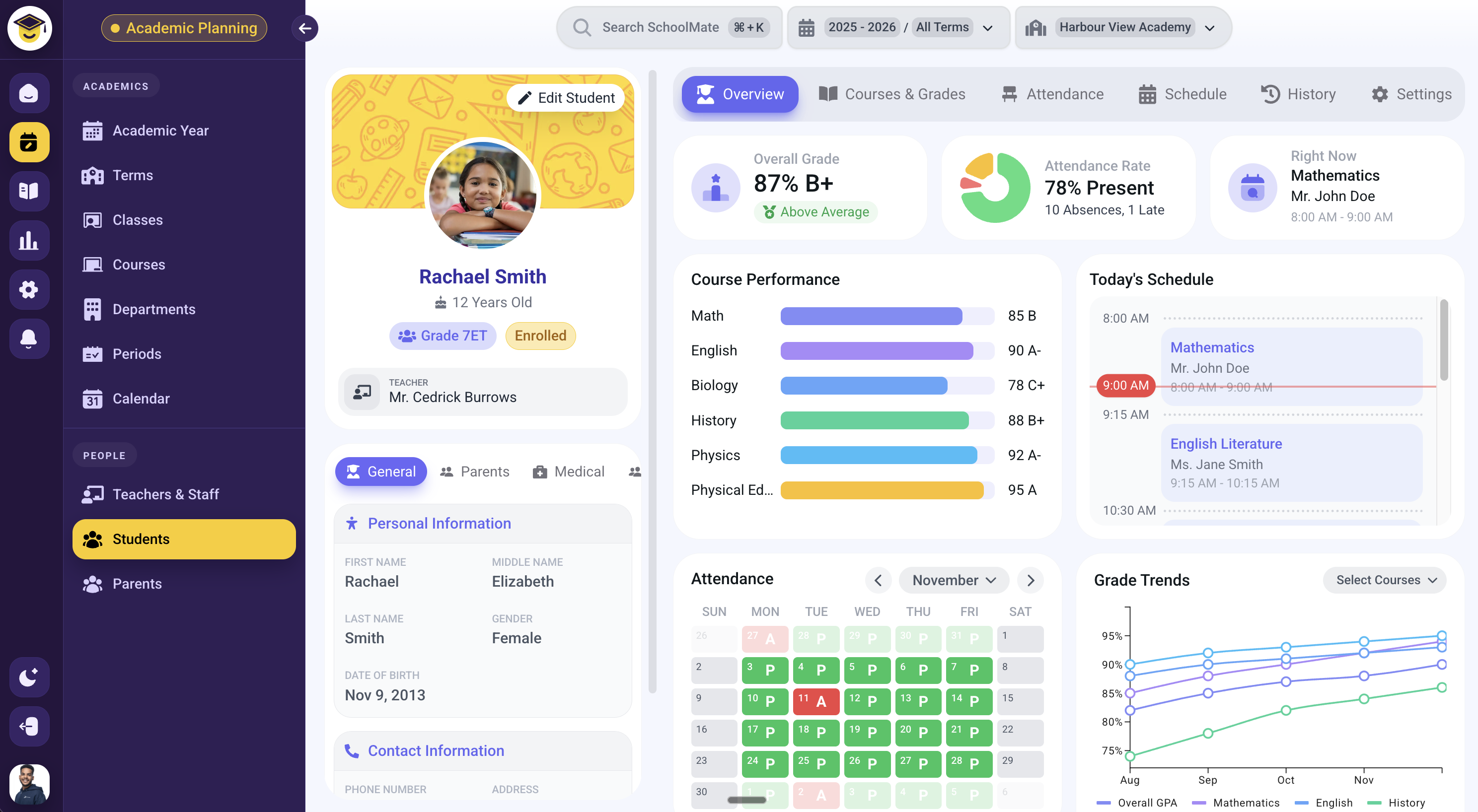 Watch improvement happen over time with trend lines that reveal whether grades are climbing, holding steady, or need your attention.